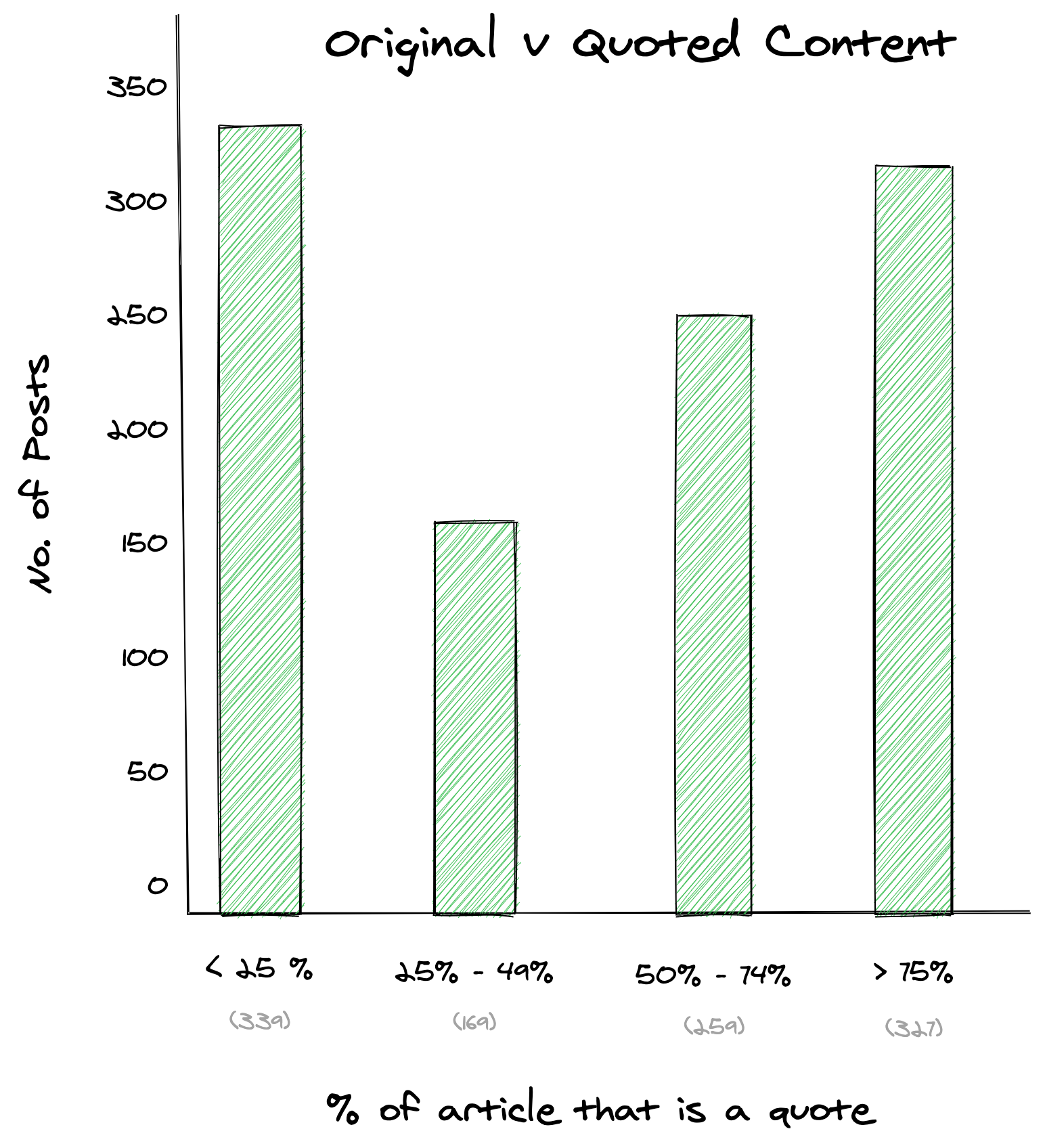 As you can see in the graph above, Farnam Street makes pretty liberal use of quotes. There is a sort-of Barbell trend where the two largest categories are (1) posts that are mostly original (<25% quoted text) and (2) posts that are mostly quoted (>75% quoted text). It’s not a strong trend though since Shane’s articles are everywhere on the spectrum.